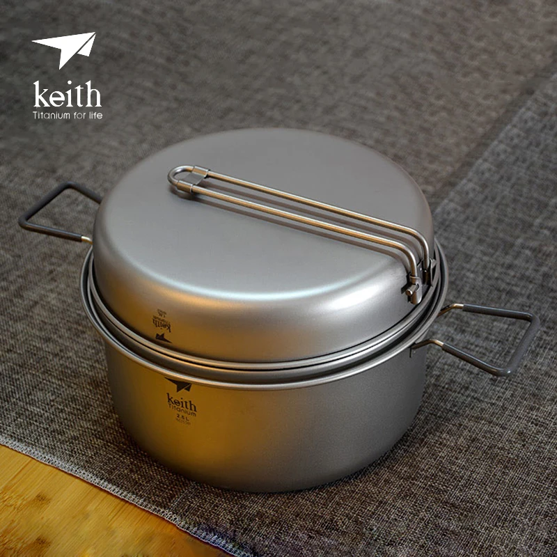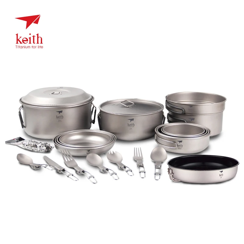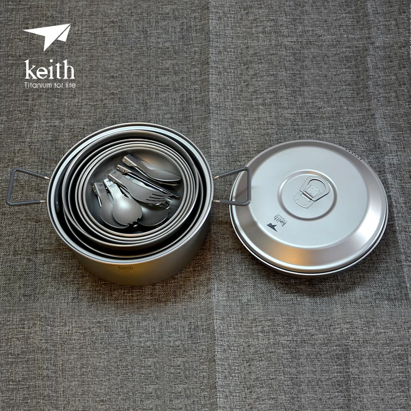 Keith Outdoor Camping 4-5 Person Titanium Soup Pot Pan Dish Plate Spoon Knife Fork Spork Durable Ki